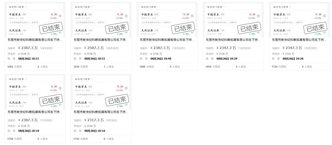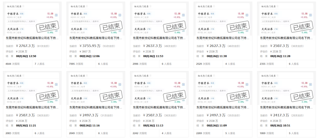 锦龙股份控股股东新世纪公司持有的3500万股非限售股,经历首轮流拍后,于8月25日如期在淘宝司法拍卖平台开启第二次拍卖。该部分股份占新世纪公司持股比例的16.59%,占公司总股本的3.91%。